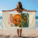 This kitschy throwback beach art is 'only in Florida' energy! A wild pin-up catches a wave as she rides an alligator like a surfboard. The surf beach at sunset scene has bold orange and red colors, complete with palm trees blowing in the tropical breeze. This fun white sand towel is perfect for your next beach day or pool party.