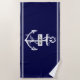 Anuncio blanco náutico, nombre y líneas azul marino Toalla de playa. Este diseño náutico muestra un ancla vintage en blanco con marco y nombre y líneas en las partes superior e inferior.