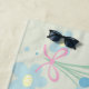 Una armoniosa mezcla de flores azules suaves con centros amarillos pálidos, atados con arcos rosas dulces, dispuestos en diferentes tamaños. Los delicados ramos se entremezclan con gusto a través de un suave fondo verde pastel amarillo-verdoso, que irradia un sentimiento de calma y simpleza.
