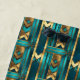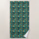 This beach towel features an art deco style geometric pattern in simulated gold and turquoise.