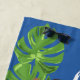 Esta toalla de playa personalizada incluye un ilustracion de estilo realista de un perro pastor australiano y algunas hojas tropicales verdes contra un fondo azul real con un punto para añadir un nombre con letras blancas en negrita.