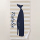 Toalla de playa de diseño de ballena azul marino grande y bonito con un fondo de franjas neutras e incluyendo su nombre en escritura marina.