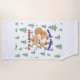 A cute and festive digital illustration featuring a chubby cartoon squirrel singing joyfully into a microphone. The squirrel is surrounded by blue musical notes, holding the mic with excitement. The text above and below reads "IT'S A FUNNY SQUEAKY SOUND" in bold red and purple font. The background consists of a repeating pattern of green sketched Christmas trees on a light grey backdrop, creating a humorous and holiday-themed design perfect for winter celebrations.