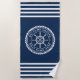 Toalla de playa con un emblema blanco y elegante de la rueda y de la cuerda del barco con el texto personalizado "bienvenido a bordo" y el nombre del barco con un fondo azul oscuro. En la parte superior e inferior de la toalla hay rayas blancas.