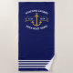 Este verano, disfrute de esta toalla de playa náutica personalizada. Esta gran toalla de playa está compuesta por una microfibra súper suave y absorbente y cuenta con un sofisticado fondo azul marino y dorado adornado con un diseño de ancla clásico, "Welcome Aboard", el nombre de tu barco y el año del establecimiento.