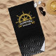 Una gran toalla de playa absorbente con un diseño clásico de la rueda de barco sobre un fondo negro y dorado. Personalízalo con tu nombre de barco para un accesorio único de playa. Ideal para los días soleados en la playa o junto a la piscina.