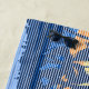 Color natural, azul y naranja. Inspirado por los camisetas de los bordadores y aloha de los años 60, este patrón utiliza rayas de alfiler para crear la línea costera mientras los surfistas esperan la pausa en Big Sunset en la costa norte de Oahu.