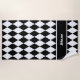 A black and white diamond pattern beach towel with space for your name.