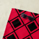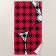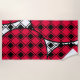 Esta toalla de playa tiene un diseño moderno de mediados de siglo de diamantes negros sólidos dentro de los contornos de los diamantes negros con manchas rosas debajo de ellos, todo en un campo de blanco.