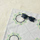 Un diseño sereno que exhibe flores verdes y blandas en plena floración. Estos delicados florales se encuentran en un marco muy cuidado con un fondo fresco de motivos geométricos en blanco y gris suave, creando una composición armoniosa y pacífica.