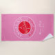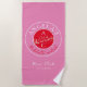 Toalla de playa contemporánea, moderna y vibrante de color rojo y magenta rosa para fin de semana de soltera con monograma - iniciales, nombre, lugar, fecha, dibujo único de pareja de amor romántico y escritura caligráfica manuscrita de moda.