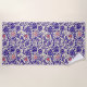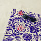 Patrón geométrico botánico floral abstracto azul y blanquecino con acentos de rojo.