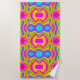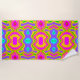 Bright Beach towel with tones of pink aqua yellow green and purple.