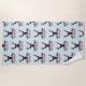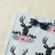 Una toalla de playa con una cabeza de ciervo negro con grandes cuerdas. Las líneas geométricas dentro de la cara del ciervo agregan un toque creativo. Flores rosas y coloridas hojas verdes de menta forman un ramo floral de bonito bajo su cabeza. Un sketch de cordillera colocado entre las flores también le da un toque rústico al campo.