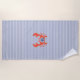 La toalla de playa de este niño es perfecta para la playa. Presenta un diseño de cangrejo monograma de color rojo acuarela y personalizado con iniciales con fondo de pinzas marina.
