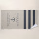 La toalla náutica de playa cuenta con un ancla de barco de estilo costero y un diseño de rayas. Personalice el texto del personalizado con un apellido familiar y una casa de playa (u otro título) con el año establecido y la ubicación. Azul marino de hale y beige accesible.