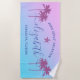 El diseño personalizado de las toallas de playa para una escapada de chica en la playa incluye un nombre personalizado en escritura moderna, acentuada por una estrella de mar y enmarcada por palmeras tropicales. Personaliza con un nombre y un texto personalizado para la ocasión especial. El fondo incluye un gradiente de puesta de sol en colores violeta, violeta y azul.