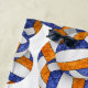 Esta toalla de playa de tipo voleibol presenta un patrón aleatorio de baloncesto de voleibol estilizado azul, naranja y blanco de tamaño variado que se doblan por todas partes - su nombre y número jersey son personalizables - por katz_d_zynes