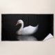 cisne blanco mudo flotando en un lago con reflexión en el agua contra fondo negro