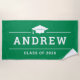 La elegante toalla de playa de graduación personalizado presenta un diseño de tipografía minimalista con tapón de paño y acentos de rayas. Personalice el texto en negrita blanco y moderno del nombre de su graduado e incluya su año de clase. El color de fondo verde se puede cambiar para que coincida con los colores de la escuela o de la fiesta de graduación. Hace un obsequio único para el pasto.