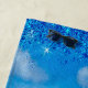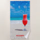 Un bonito ilustracion de una playa de arena blanca con un cielo azul y un cóctel. El cielo y la arena están decorados con purpurinas en azul y blanco