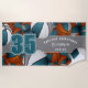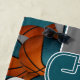 Esta divertida toalla de playa para jugadores de baloncesto tiene baloncesto de tamaño variado con colores de equipo verde azulado y gris girados de todas formas en un fondo verde azulado y un número jersey prominente en verde azulado sobre una franja de color gris de largo, sobre la que también se puede personalizar el nombre del atleta, nombre del equipo y nombre de la mascota - por katz_d_zynes