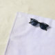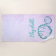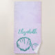 Toalla con conchas verde azuladas y fondo de color morado lavanda