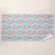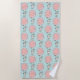 Una toalla de playa con un caprichoso conejo blanco sosteniendo un gran globo rosa flotando en el aire. Está situado sobre un fondo azul-verde claro.