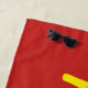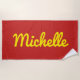 Esta característica del diseño simple de la toalla de playa un nombre personalizado en un amarillo escritura-como fuente en un fondo rojo.