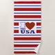 Esta espaciosa toalla de playa muestra mi logo "I Heart The USA", sobre un fondo de rayas patrióticas rojas, blancas y azules.