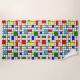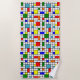 Esta toalla de playa tiene un diseño Bauhaus de una rejilla con cuadrados y rectángulos en rojo, verde, azul, naranja, azul claro, amarillo y rojo.