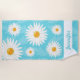 Esta toalla de playa cuenta con flores de margarita blancas ilustradas de Destei en varios tamaños. El color de fondo es azul y tiene un patrón claro de hojas. También hay un área de texto personalizable para un nombre en la parte inferior.