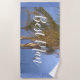La mejor playa de Man o el tema de la boda de destino. El Mejor Hombre está escrito en escritura blanca. El fondo tiene un cielo azul con la bonito de tres palmeras con los frondos soplando en la brisa del océano. Toallas de playa para la fiesta de bodas. Fotografía original y diseño © TamiraZDesigns.