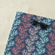 Toalla de playa de inspiración oceánica con rayas de coral zigzag en azul acuático, rosa polvoriento y taupe, sobre un fondo azul marino.