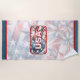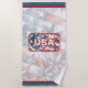 Una divertida toalla de playa de color rojo, blanco y azul, junto con "USA". Utilice la plantilla para personalizar. Puede conservar el texto o cambiarlo.