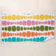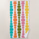 Esta toalla de playa tiene un diseño moderno de mediados de siglo de líneas verticales de rectángulos redondeados de tamaño creciente y decreciente en colores retro de rojo, verde, azul, amarillo, naranja y marrón en un campo de blanco.