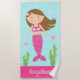 Esta toalla de playa monograma personalizada incluye una sirena dulce de color rosa. Tiene el pelo marrón claro y los ojos grises y nada bajo el mar con sus amigas rosadas de estrella. Esta toalla se puede personalizar con un nombre. No dude en cambiar la fuente y el color de la fuente si lo desea.
