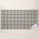 Two images of bathroom accessories with geometric floral patterns. The top image shows towels hanging, and the bottom shows a folded washcloth. The pattern features white flowers on a beige background, creating a modern, decorative look."