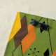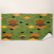 Esta toalla de playa tiene un diseño de diamantes moderno de mediados de los años 70, y estribos en un campo verde.