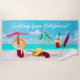 Tres pimientos rojos en la playa. Días soleados, mar azul, arena blanca, paraguas y sombreros. Dos pimientos son somnolientos bajo las sombrillas, el tercero tiene una profundidad de cintura en el agua. Cada hora es feliz en la playa. Sol, mar, arena, Sombrero. ¡Saludos de texto blanco desde California! La divertida toalla de playa de personalizable. Puede cambiar la imagen y puede cambiar o eliminar el texto de la plantilla. ¡Diviértase y disfrute de las vacaciones de verano!
