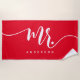 La Toalla De Playa Personalizada De Mr. Red And White New Groom. Toalla de playa de nombre personalizado de un maestro de escritura moderna. Toalla perfecta para luna de miel para el novio. Personalice este diseño personalizado con su propio nombre o texto.