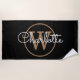 Toalla de playa clásica con monograma negro y dorado. Puedes personalizar el nombre, monograma y personalizar la fuente y los colores para crear tu propio diseño único. Diseñado por Thisisnotme