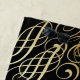 Elegante Relieve metalizado falso dorado filigree efecto de apariencia guión de desplazamiento sobre negro. Añada una inicial a esta pieza de glamour inspirada en Hollywood Regency.
