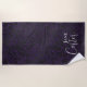 Elegante toalla de playa de leopardo negro morado con tipografía de personalizable en letra de escritura a la moda y personalizada con tu nombre.