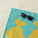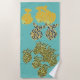 Dibujo mosaico, gráfico, con grupo, de rayas y esténcil, con peces mostrados en colores brillantes de; naranja, rojo, amarillo, oro, taupe, marrón, negro y blanco, con fondo de huevo-azul de robin.