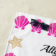 Personalice el nombre de la escritura negra con conchas de mar rosadas y estrellas de oro sobre fondo blanco.