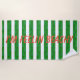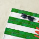 Serie de tablas apiladas, planchas en verde, y verde claro, rayas, mezcladas con gris, sobre un blanco, con el fondo estampado, con la frase, "Soy la playa de Feelin", en letras vibrantes en naranja, en bloques.