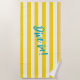 Toalla de playa a rayas amarillas y blancas con toldo, con las palabras ¡Zambullirse! Toalla fabulosa para su fiesta en el club de día o vacaciones en la playa.