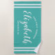 Diseño de toalla de playa personalizada para el fin de semana de vacaciones de chicas presenta un nombre personalizado en escritura moderna enmarcado por rayas costeras, con texto personalizado para la ocasión. El color de fondo azul turquesa / verde azulado se puede modificar. Por favor, visite nuestra tienda para otras opciones de color.