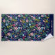 Floral con follaje flotante, flores estilizadas en bonito, hojas, bayas, bellotas y puntos de acento polka en tonos verdes, azules, rosas, violetas y amarillos con acentos en naranja, rojo y marrón. Ajustado en fondo azul oscuro. Use las plantillas para personalizar con su nombre o mensaje en una fuente rosa en una banda azul oscura.